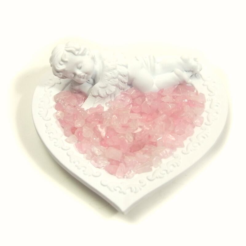 エンジェルの前には魅力アップと恋愛のパワーを引き寄せ強めると言われるローズクォーツさざれが広がり、お部屋の「気」を整えます。